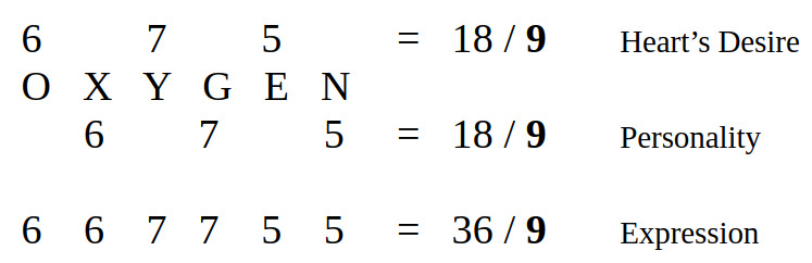 Oxygen’s Personality, Heart’s Desire and Expression are all 9. Expression is 36/9.¹