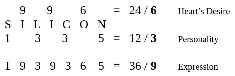 Silicon’s Personality, Heart’s Desire and Expression are 3, 6 and 9. Expression is 36 / 9.